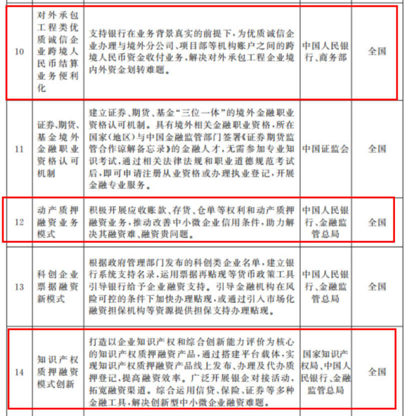 近日,国务院印发《关于做好自由贸易试验区第七批改革试点经验复制推广工作的通知》(下称《通知》),在全国范围内和特定区域复制推广第七批共计24项自贸试验区改革试点经验,其中包括“跨境人民币资金收付”“动产质押融资”““打造知识产权质押融资产品”等多项信用改革试点,助力解决“对外承包工程企业境内外资金划转难”“中小微企业融资难、融资贵”等问题。