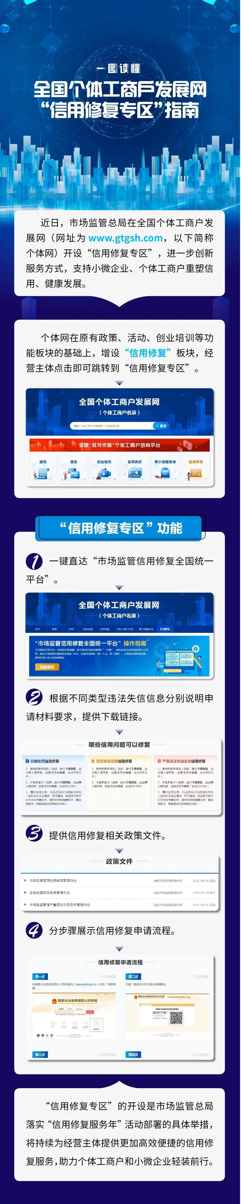 近日,市场监管总局在全国个体工商户发展网(以下简称个体网)开设“信用修复专区”,进一步创新服务方式,支持小微企业、个体工商户重塑信用、健康发展。
