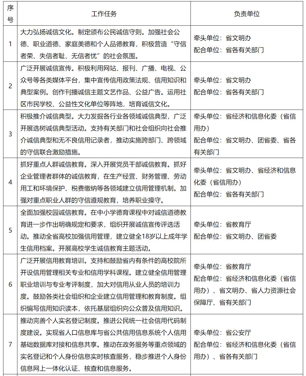 (四)强化责任分工落实。各地各有关部门要按照本实施意见的任务分工,认真抓好责任落实,制定实施计划,确保责任到岗、工作到人、措施到位;将各地各部门个人诚信建设成效纳入政府部门绩效考核体系,确保各项工作平稳有序推进。