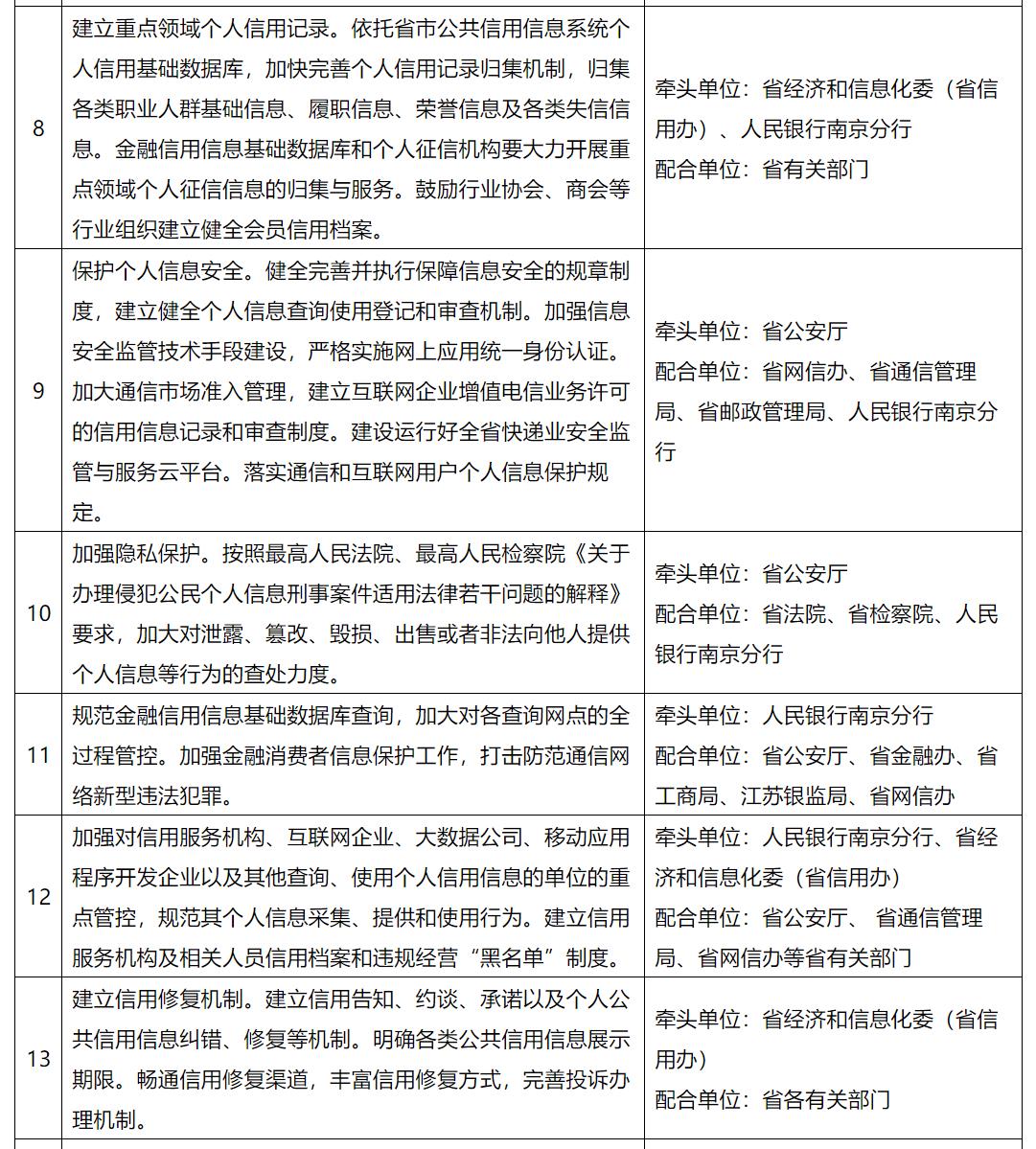 (二)强化法规政策支撑。各地各有关部门要强化对个人诚信体系建设的法规政策支持,加快完善个人公共信用信息记录、归集、处理和应用等各环节的规范制度,健全个人信用信息共享应用、失信程度认定、信用修复、信息安全及隐私保护等规章制度。