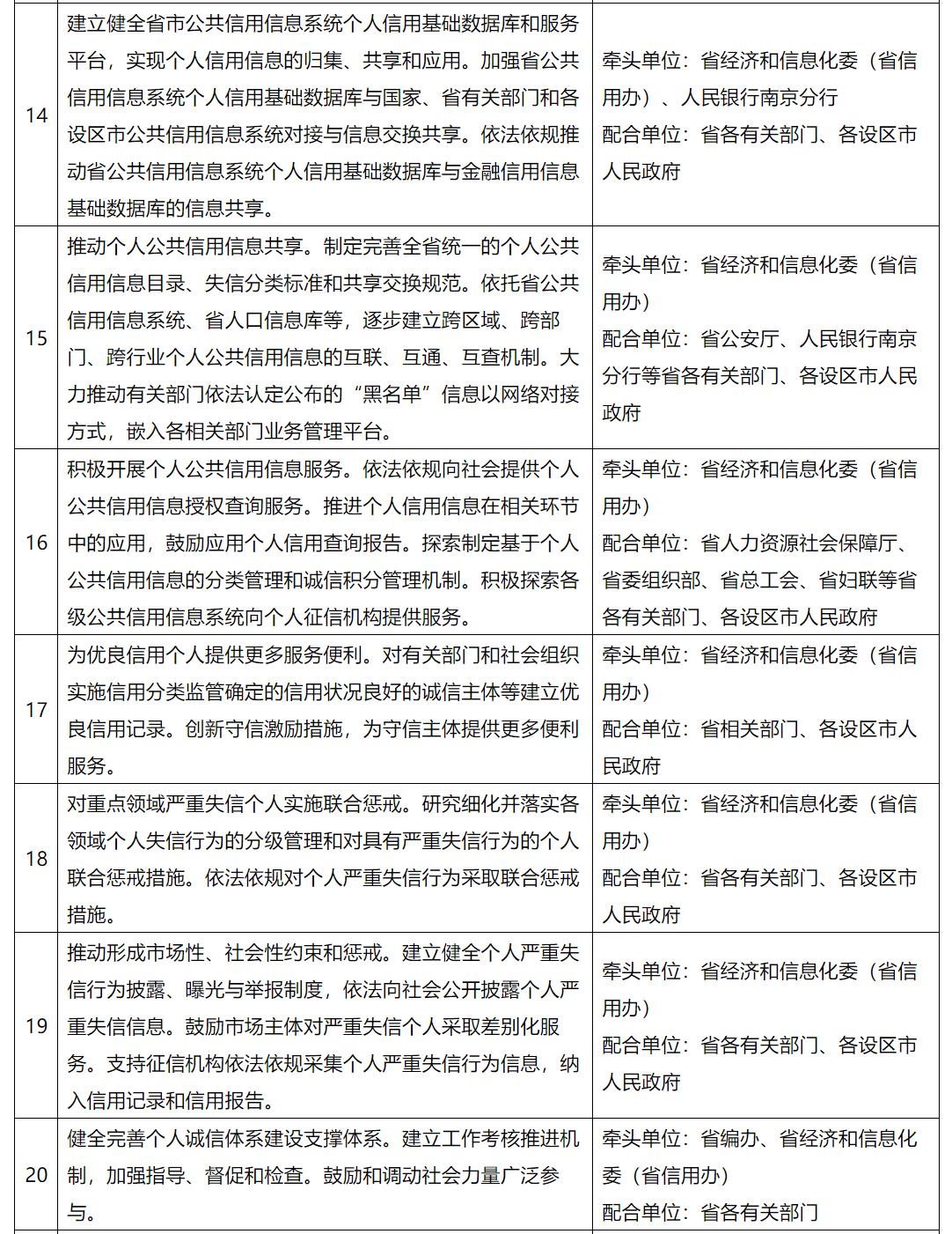 (一)建立健全省市公共信用信息系统个人信用基础数据库和服务平台。以重点职业人群信用信息归集为突破口,进一步完善省公共信用信息系统个人信用基础数据库,不断开发完善平台服务功能,实现个人信用信息的归集、共享和应用。加强省公共信用信息系统个人信用基础数据库与国家、省有关部门和各设区市公共信用信息系统对接与信息交换共享。依法依规推动省公共信用信息系统个人信用基础数据库与金融信用信息基础数据库的信息共享。各设区市要按照全省统一规范,加强个人信用基础数据库建设,归集全市个人基础信息、信用信息,包括资格资质、表彰奖励、公共事业费欠缴、金融活动、行政许可、行政处罚等信息,逐步实现各部门信息归集交换全覆盖。各市信用网站开辟重点人群信用信息查询专栏,面向社会提供查询服务。推广现代化服务手段,利用网站、手机APP、公众号等形式提供多渠道的信息查询服务。支持有条件的县建设县级个人信用基础数据库。