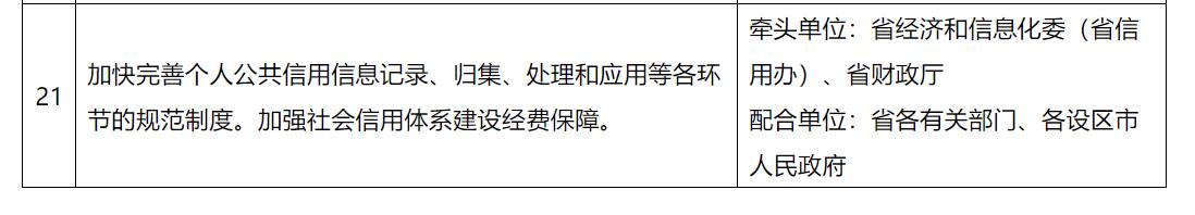 ——2018年底,制定出台省级个人公共信用信息目录、失信分类标准和共享交换规范,完成重点领域重点人群个人信用记录建设,实现公民统一社会信用代码全覆盖,建立健全个人及其行为的信息记录、归集、管理和使用,以及信息安全和隐私保护机制。