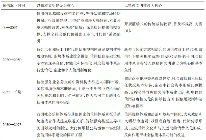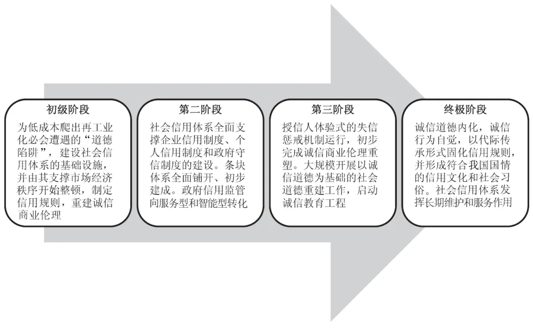 比较英国、法国、美国、日本和新加坡跨越工业化“道德陷阱”和社会道德重建的经历,参照我国建设和运行社会信用体系的历程,我们可以推论出社会道德重建和商业伦理重塑是具有规律性的。要实现愿景设立的任务目标,社会信用体系建设须取得若干个阶段性的成果,长期循序渐进地持续推进,大致情况如图3所示。