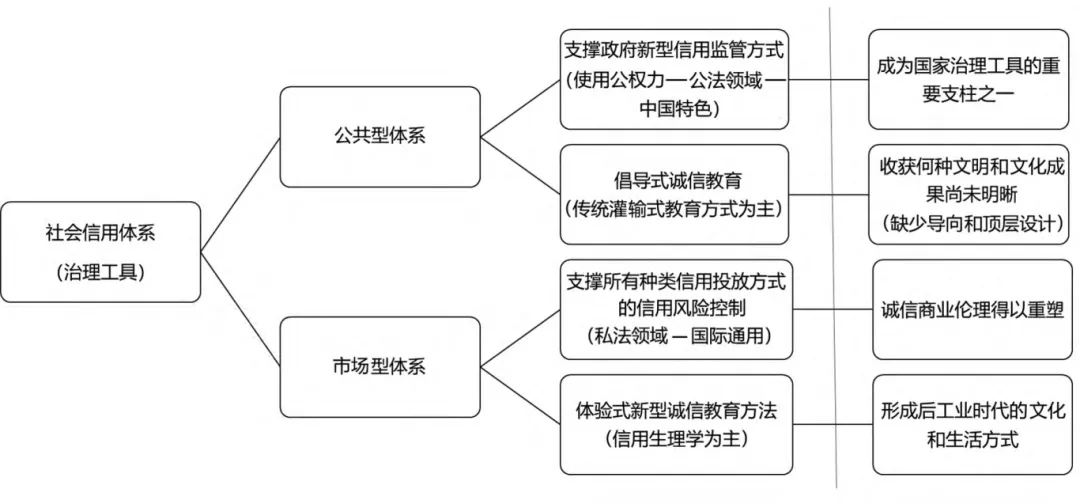 (1)按子系统划分。市场型体系适于市场主体及一般信用经济及信用风险控制活动,具备跨行业、跨领域、跨国界的普适性功能。公共型体系以支撑政府信用监管、行政执法和公共服务为核心,强化政策执行和行政管理的信用约束机制。