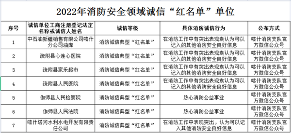 根据《喀什地区消防安全领域信用管理办法》,下列单位列入2022年上半年喀什地区消防安全领域诚信“红名单”,现进行公告: