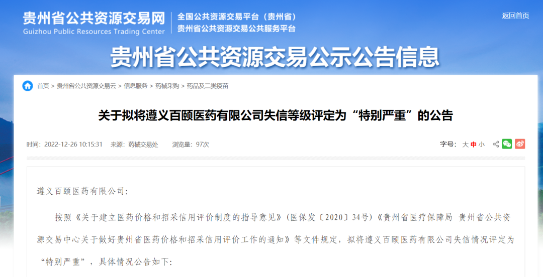 近日,贵州公共资源交易中心发布公告,遵义百颐医药有限公司被评定为“特别严重”失信。