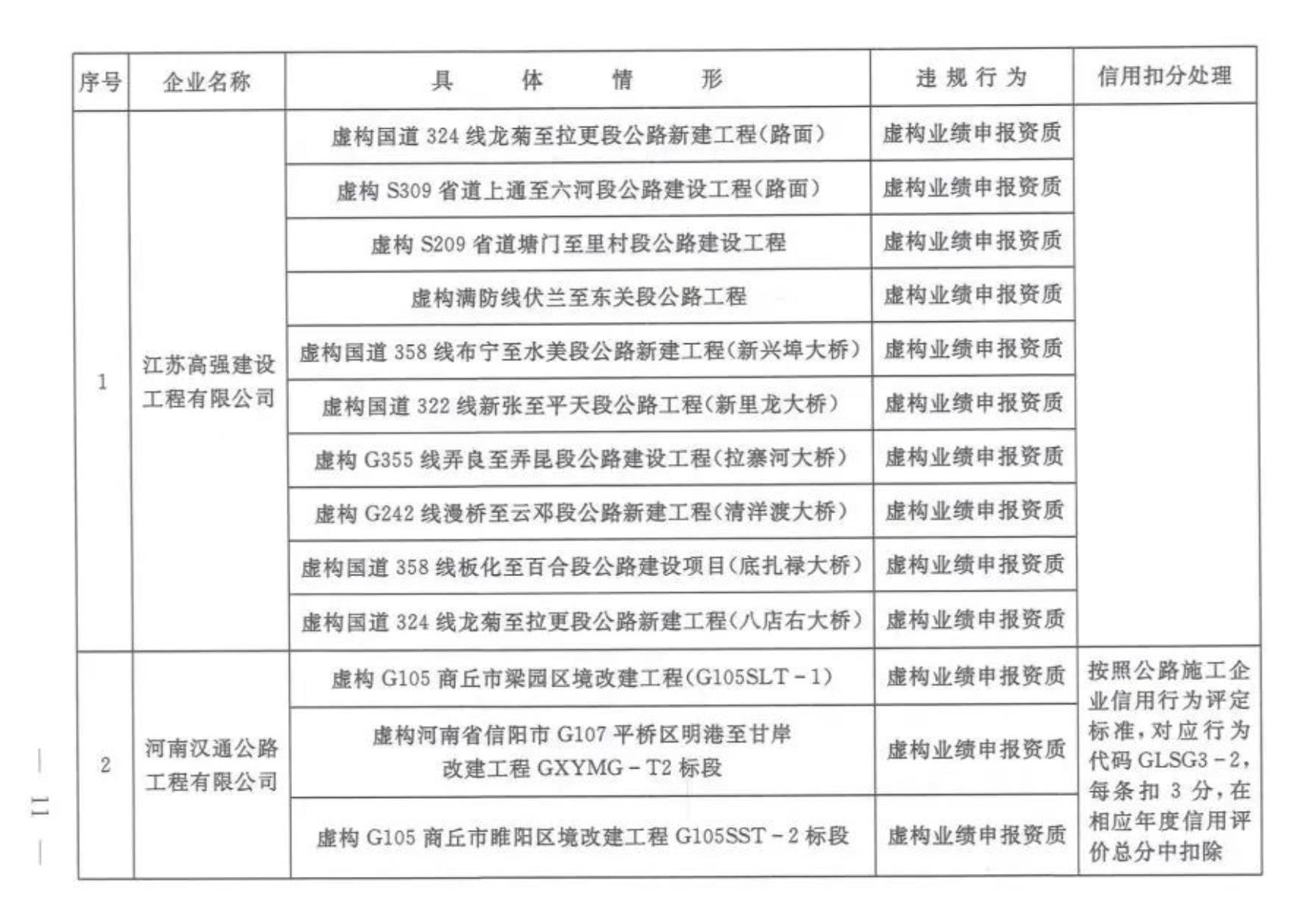 11家施工企业在资质申报过程中存在虚构业绩等弄虚作假行为,1家施工企业存在超资质承揽业绩行为。