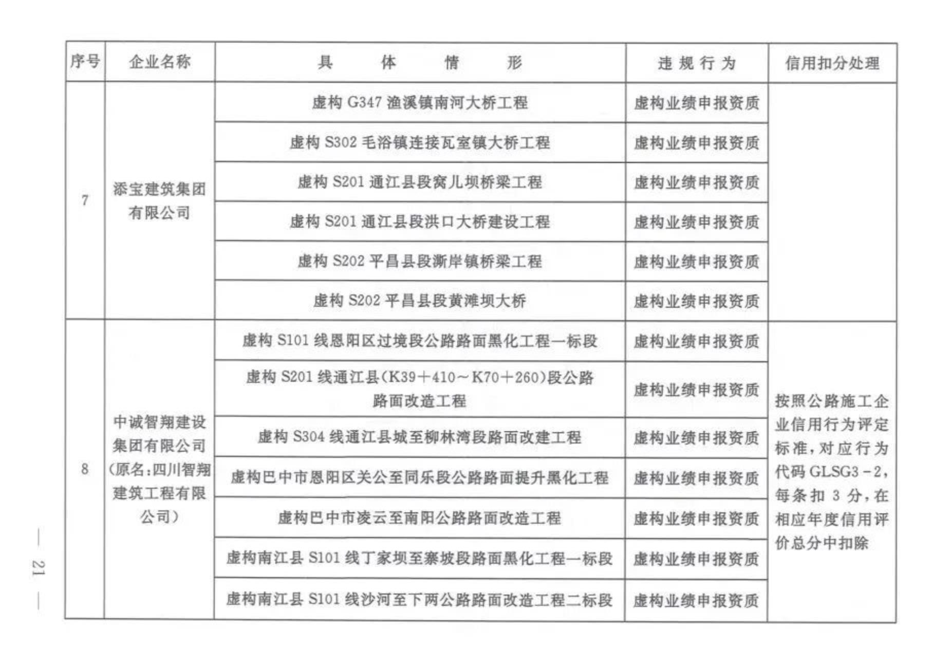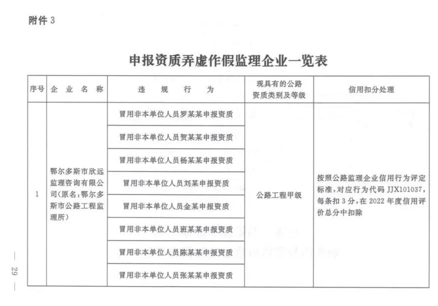 (二)根据《公路建设市场信用信息管理办法》《公路设计企业信用评价规则》《公路施工企业信用评价规则》《公路水运工程监理信用评价规则》等有关规定,对上述23家企业中已具备公路相关资质的沈阳中远交通勘察设计工程服务有限公司等7家设计企业、江苏高强建设工程有限公司等13家施工企业和鄂尔多斯市欣远监理咨询有限公司1家监理企业,部将指导相关省级交通运输主管部门在年度公路建设市场综合信用评价中作出信用扣分处理。