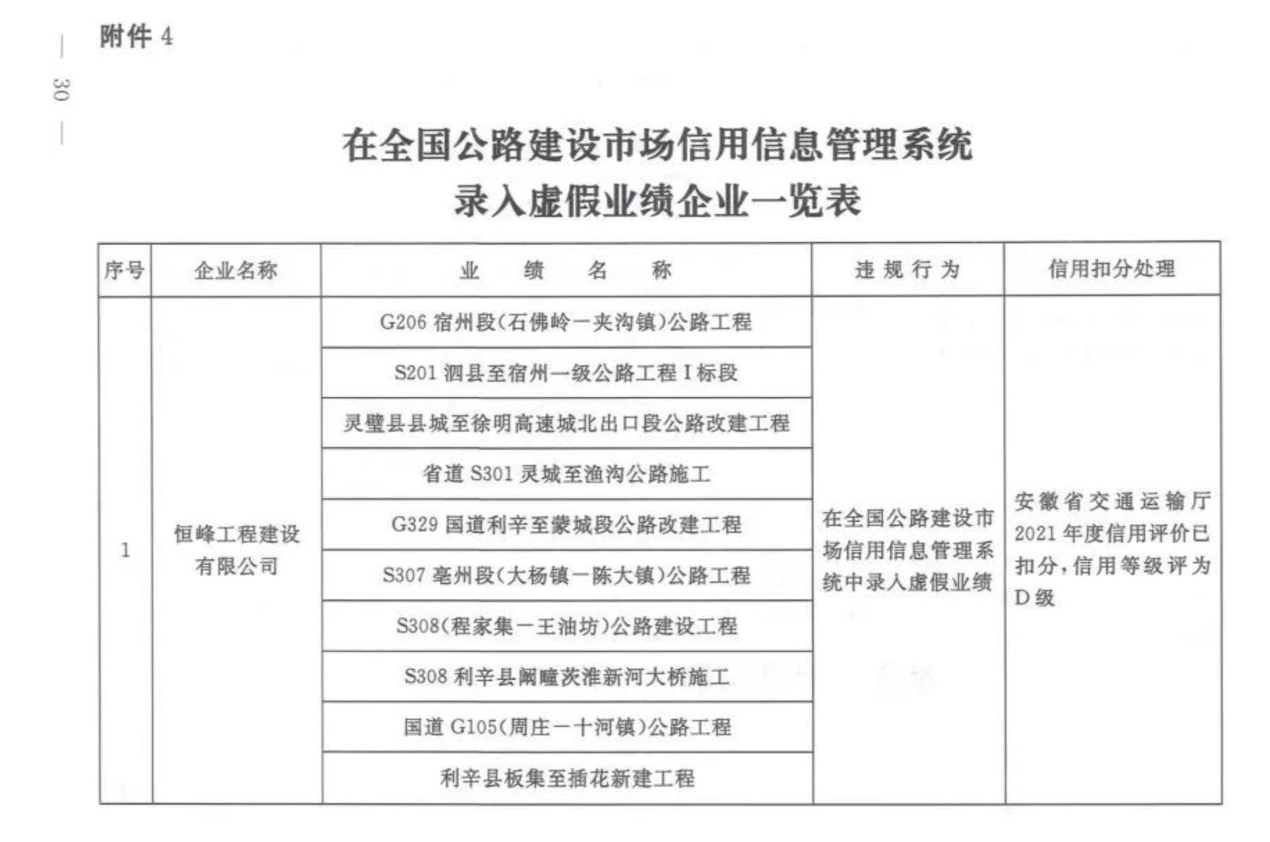 恒峰工程建设有限公司在全国公路建设市场信用信息管理系统录入虚假业绩。