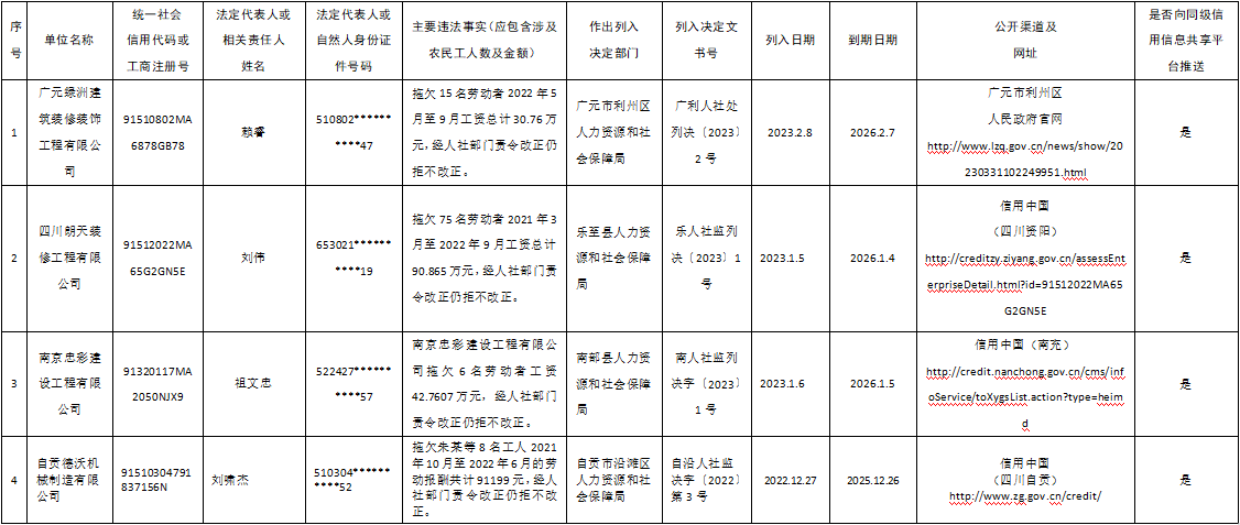 记者从四川省人力资源和社会保障厅网站获悉,为加大对重大劳动保障违法行为的惩戒力度,强化对用人单位守法诚信的社会监督,根据相关规定,日前,四川公布了我省2023年第一季度重大劳动保障违法行为及拖欠农民工工资失信联合惩戒对象名单。