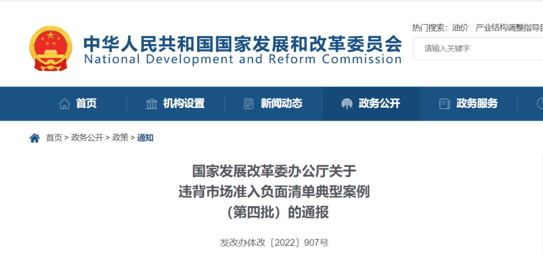 近日,国家发展改革委发布《关于违背市场准入负面清单典型案例(第四批)的通报》,国家发展改革委会同有关部门、地方发展改革委和第三方机构对违背市场准入负面清单情况进行排查处理,现对案例及处理情况进行通报。