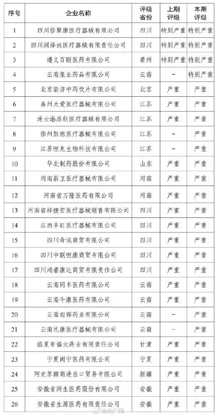 受国家医疗保障局委托,国家医疗保障局医药价格和招标采购指导中心汇总了截至2023年12月31日各省份评级为“特别严重”和“严重”失信的医药企业情况,现公示如下: