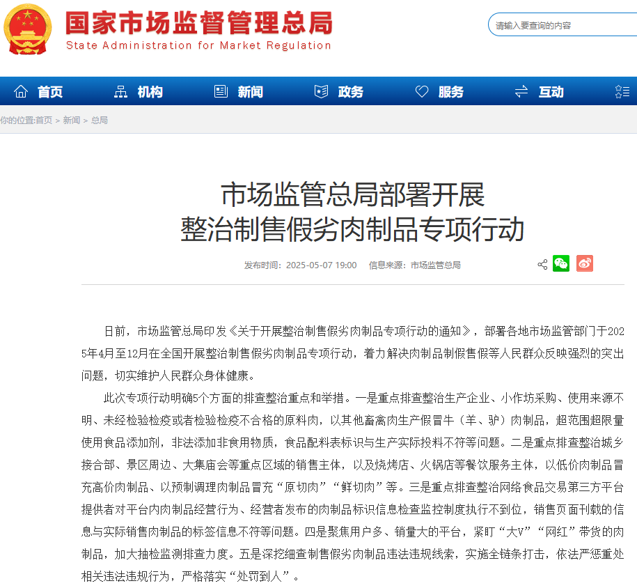 日前,市场监管总局印发《关于开展整治制售假劣肉制品专项行动的通知》,部署全国各地市场监管部门于2025年4月至12月开展专项行动,严厉打击制售假劣肉制品行为,切实维护人民群众身体健康和消费权益。
